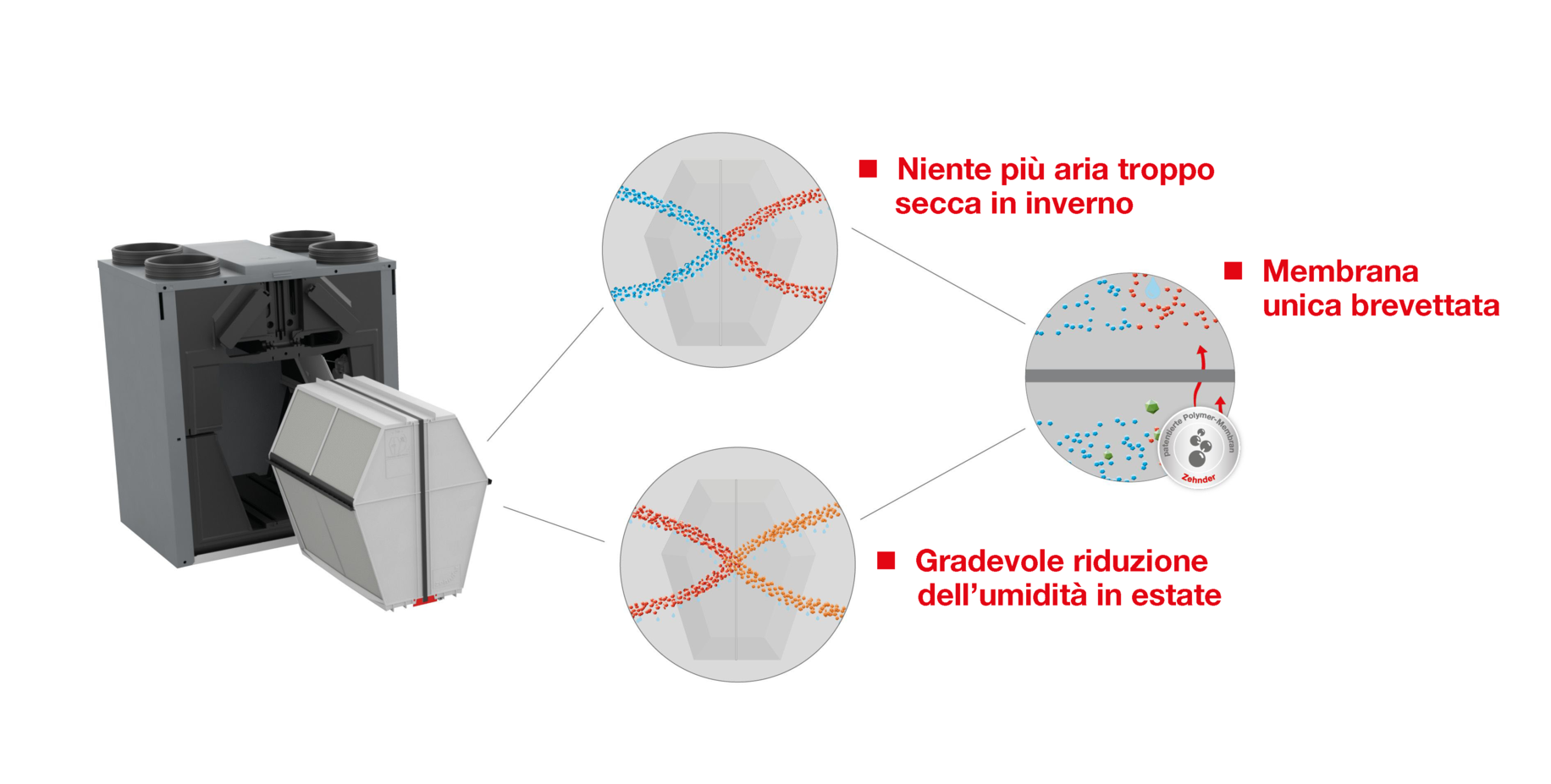 I sistemi di ventilazione comfort di Zehnder con scambiatore entalpico recuperano fino all'80% di calore e fino al 70% di umidità.