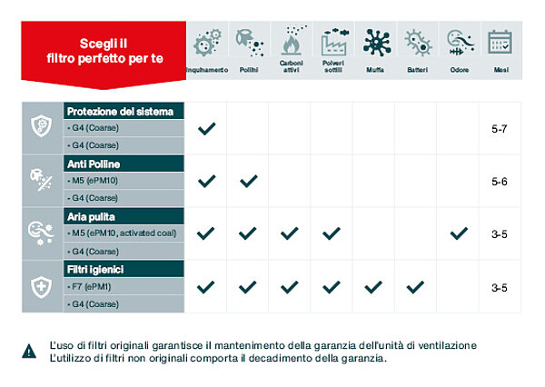 La sostituzione del filtro al momento giusto assicura che il sistema continui a funzionare in modo efficiente e silenzioso, prolungandone la durata. Zehnder consiglia di cambiare i filtri ogni sei mesi per garantire prestazioni ottimali. Per facilitare questo processo, il servizio di promemoria dei filtri Zehnder vi avvisa quando è il momento di sostituirli. In questo modo, non dovrete mai preoccuparvi di dimenticare di cambiare il filtro e potrete sempre godere di un'aria fresca e pulita in casa vostra.