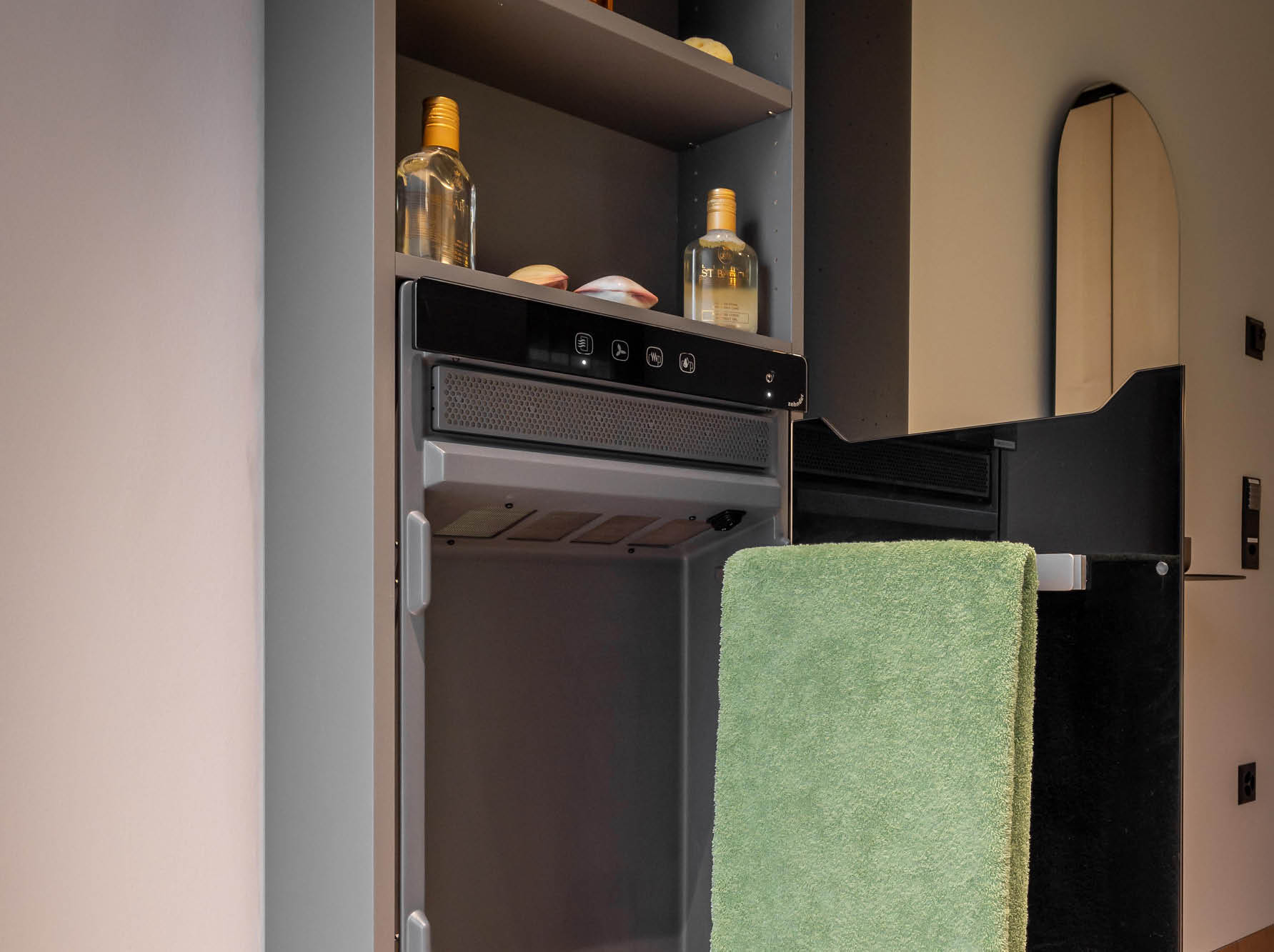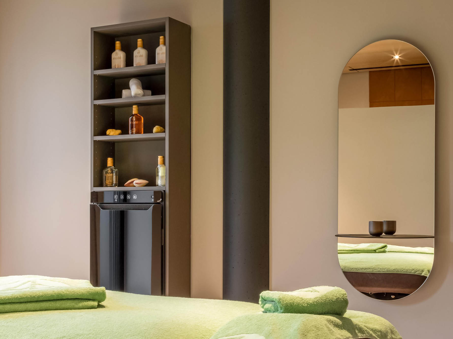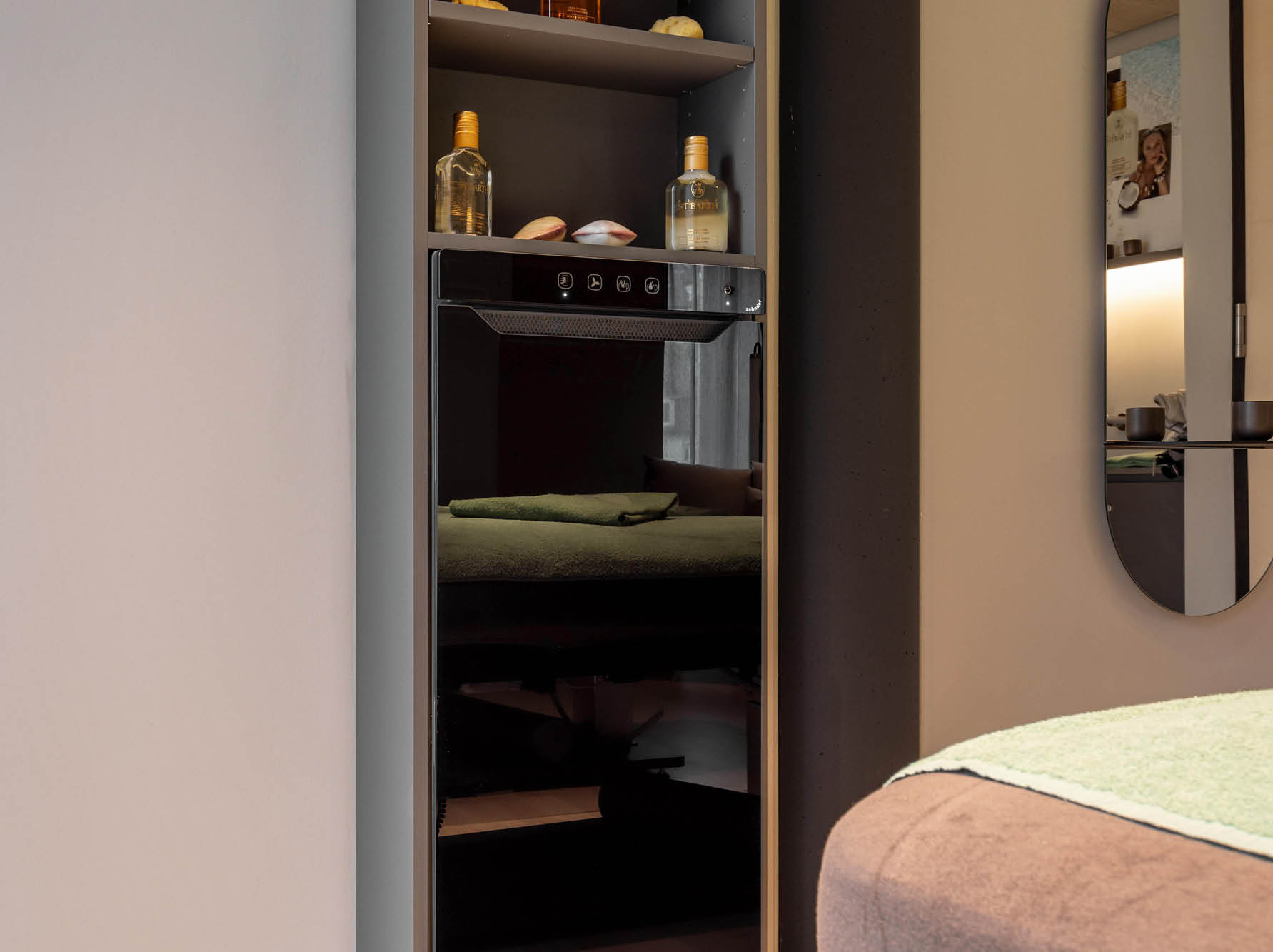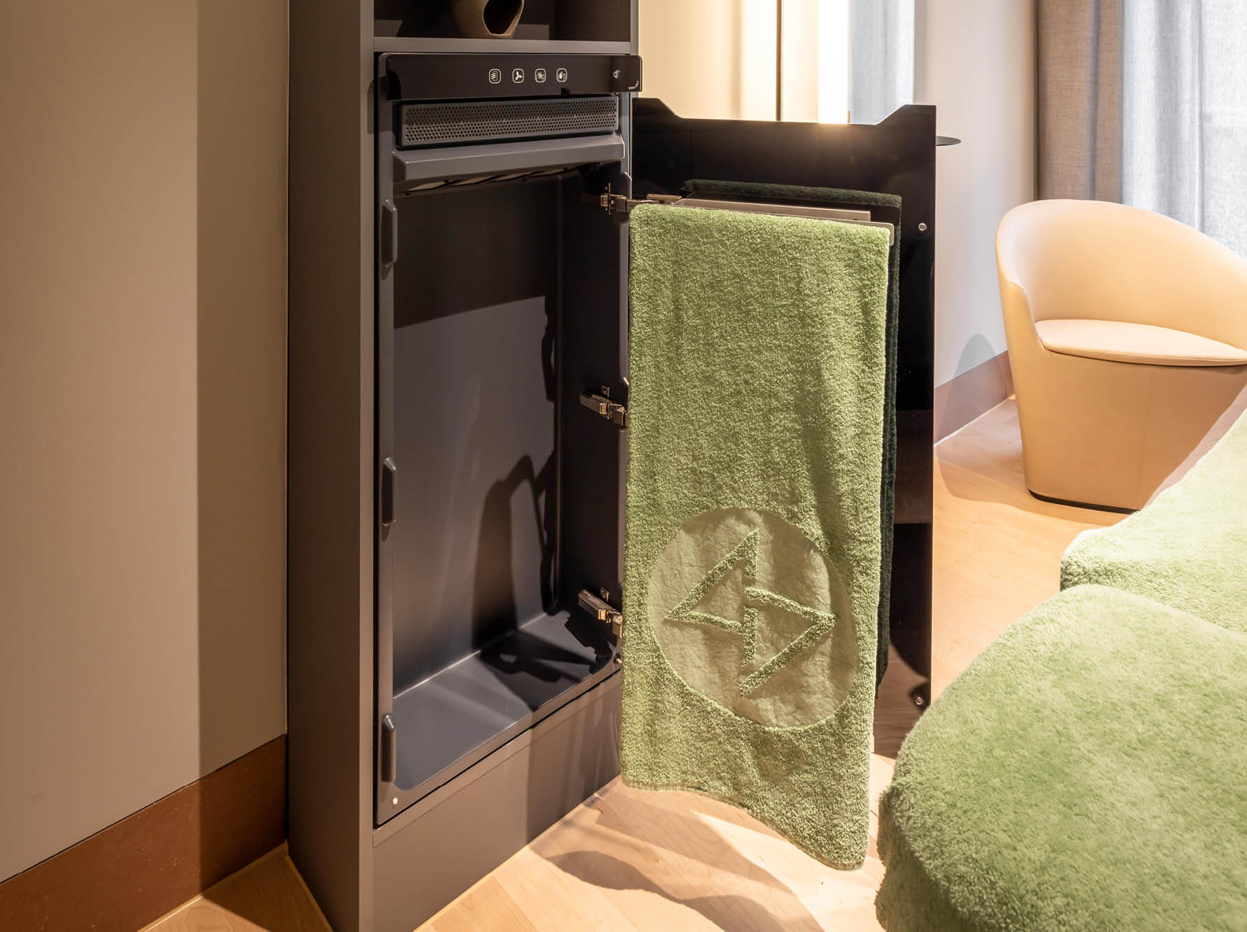 Per le sale dei trattamenti cosmetici nella zona spa, la proprietà cercava un prodotto in grado di preriscaldare e asciugare gli asciugamani che fosse poco ingombrante e installabile facilmente anche dopo il completamento dell’involucro edilizio.