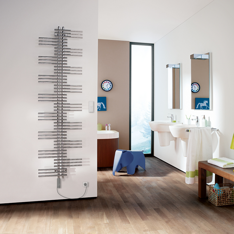 Zehnder Yucca, l'originale a "forma di palma". La disposizione dei tubi tondi orizzontali, simmetrica ed aperta lateralmente, è perfetta per appendere salviette, accappatoi e abiti. Il radiatore si contraddistingue per la profondità ridotta e il design curato ed elegante. Disponibile in numerosi colori e superfici della cartella colori Zehnder e cromato.