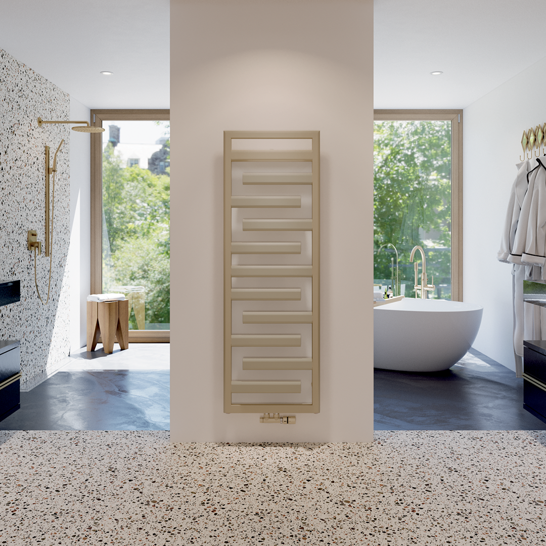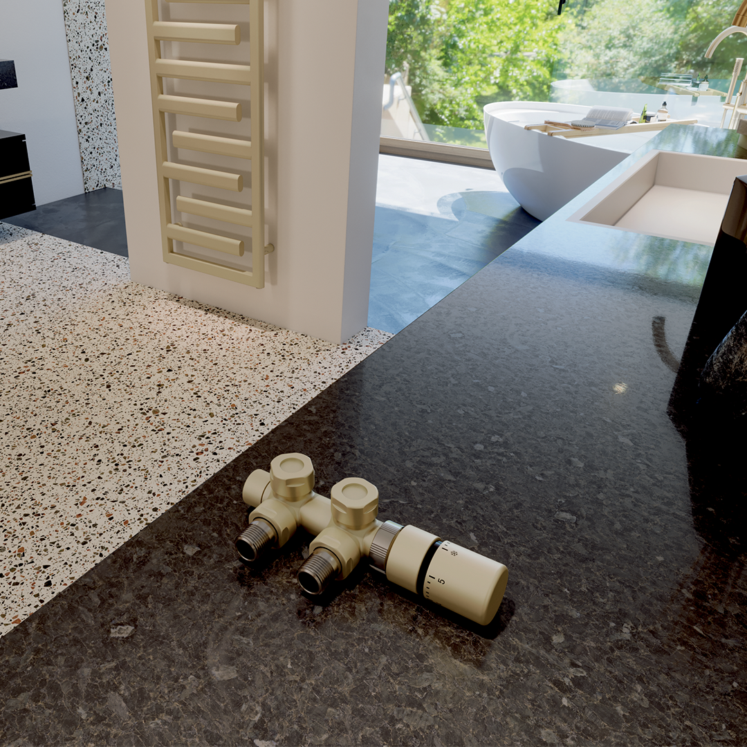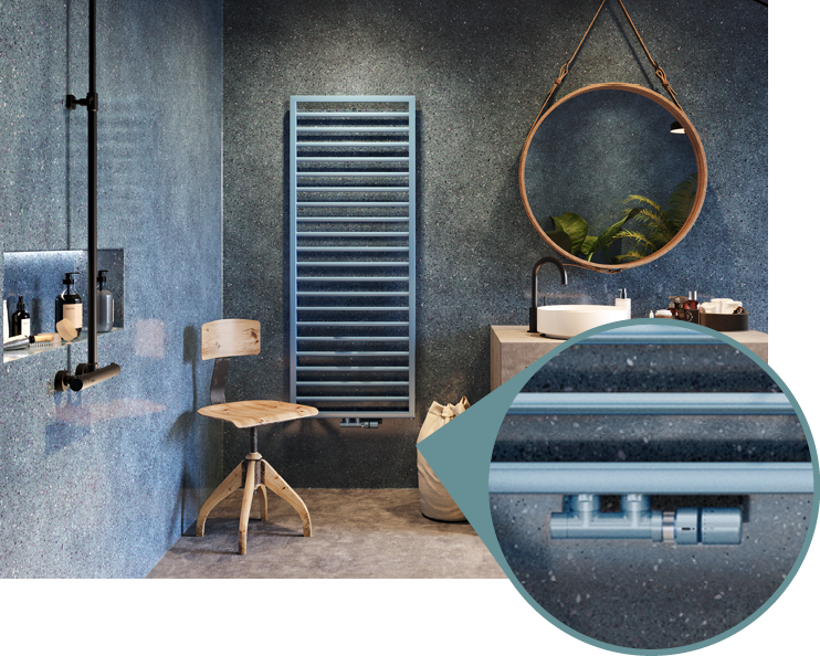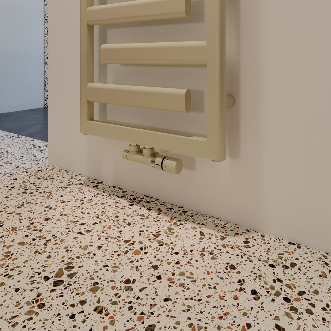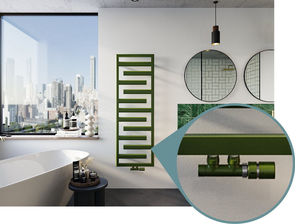 L'abbinamento dei colori tra radiatore, raccordi, valvole e testine termostatiche garantisce un aspetto armonioso ed elegante al vostro bagno o al vostro soggiorno.